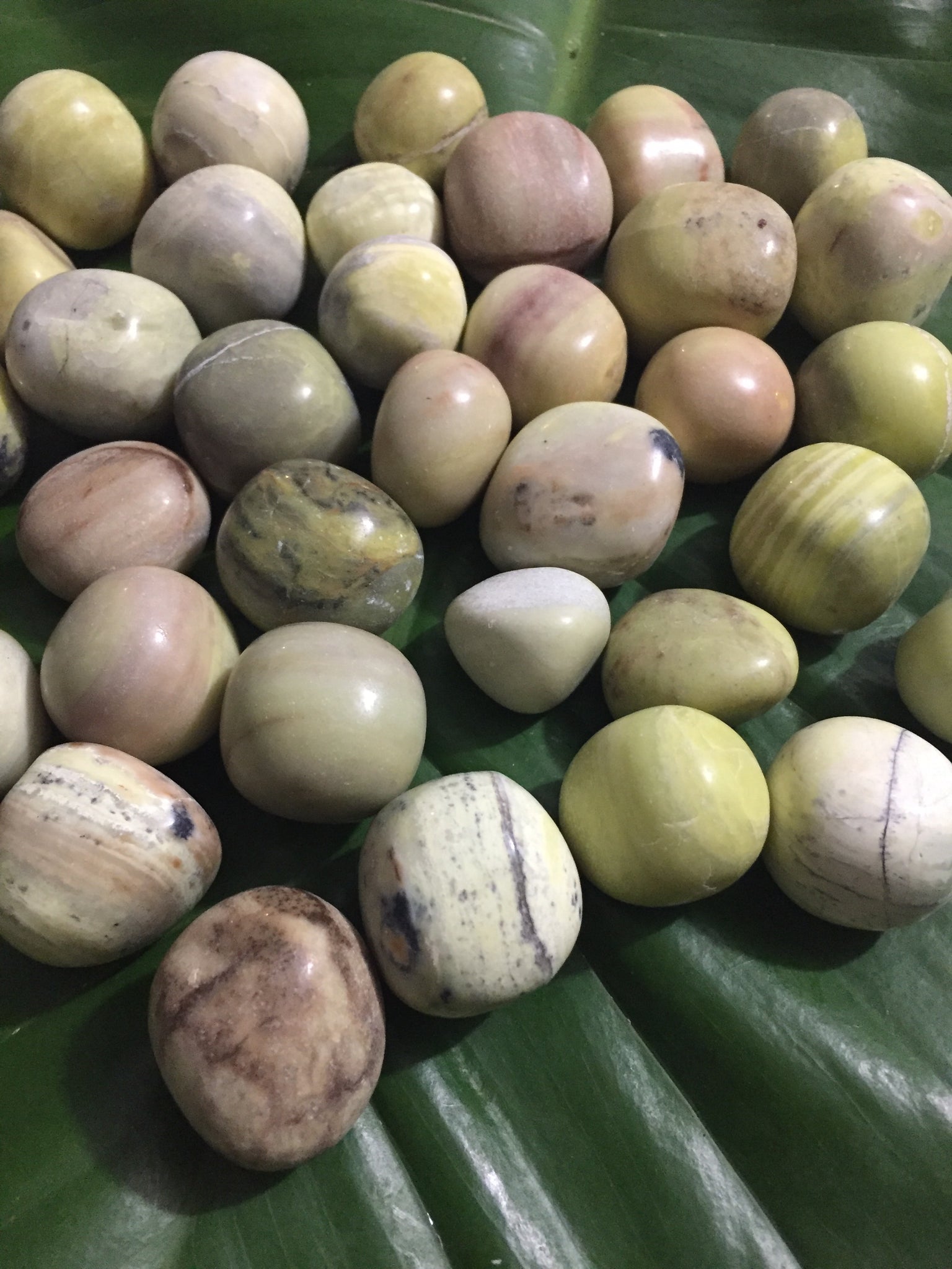 Green Serpentine Big Tumblestones Size and forma vary aprx 1”-1 1/2”. Mineral information is included.