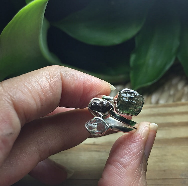 Rough Moldavite / Campo del Cielo Meteorites, Herikmer Diamond 925 Silver Spiral Ring Germs pieces are unique. Each piece vary in size and shape. Each piece vary in size and shape. Please see pictures as reference.